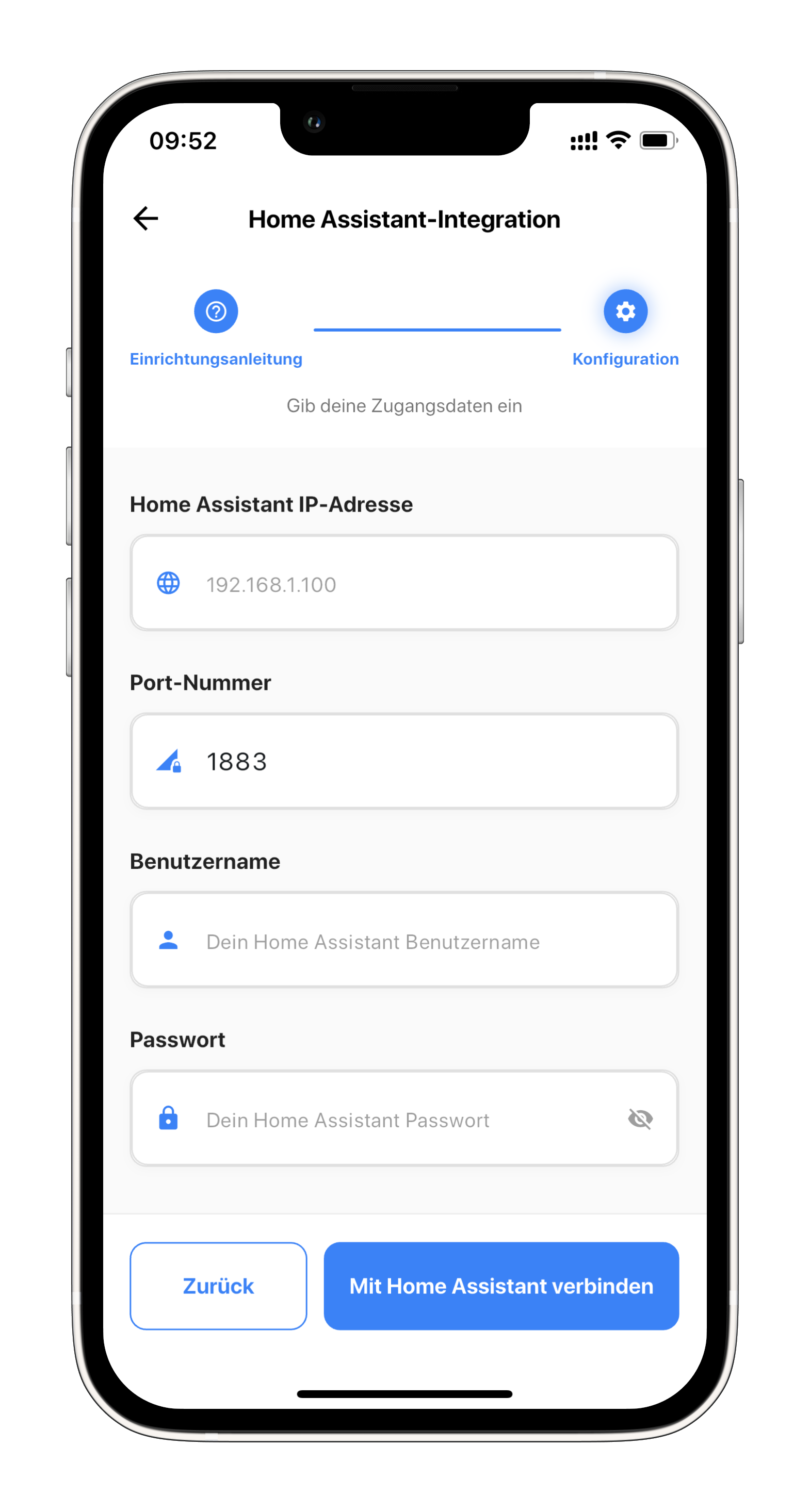 Bevor du mit dieser Anleitung beginnst, stelle sicher, dass du die Home Assistant Grundeinrichtung abgeschlossen hast. Sie benötigen die MQTT-Zugangsdaten (IP-Adresse, Benutzername, Passwort und Port).