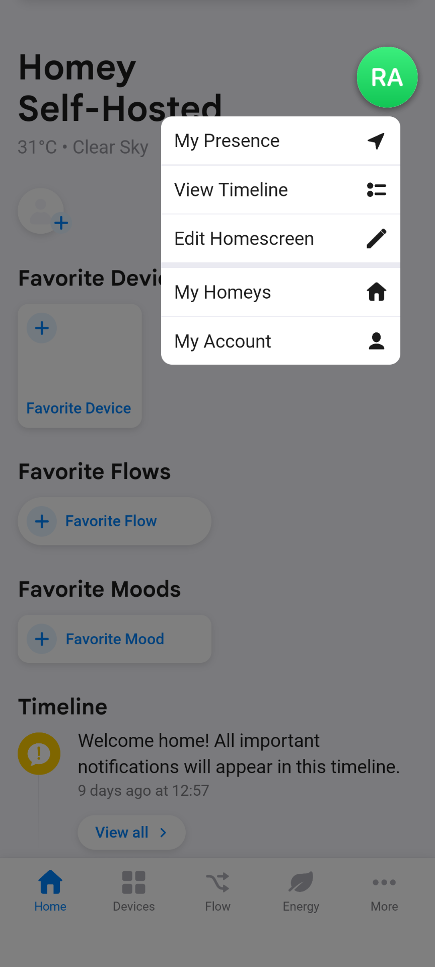 - Open the Homey app and go to the Home screen (house icon at the bottom left).